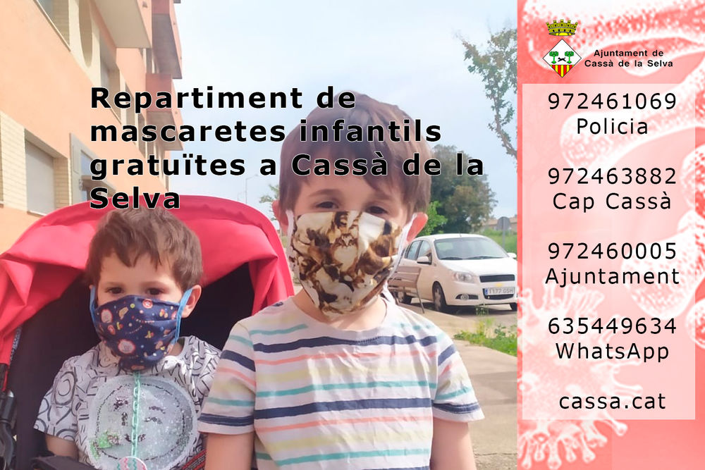 Les mascaretes són per a nens i nenes de 3 a 12 anys residents a Cassà i el repartiment es farà dijous al Pavelló Polivalent. El sistema de repartiment anirà per edats i franges horàries.