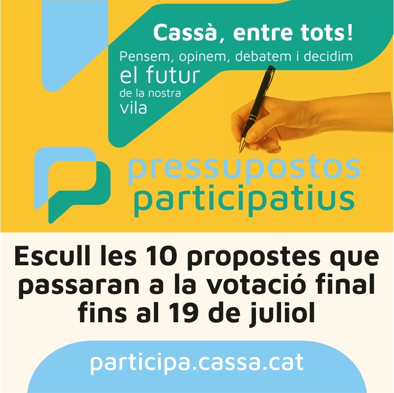 L’Ajuntament de Cassà de la Selva ha obert un termini fins al 19 de juliol per votar online les propostes que més us interessin dels Pressupostos Participatius. Les votacions es poden fer accedint al formulari que trobareu al web www.cassa.cat . De les 27 propostes presentades se n’han d’escollir 5 com a mínim. Les 10 més votades passaran a la fase final de votació.