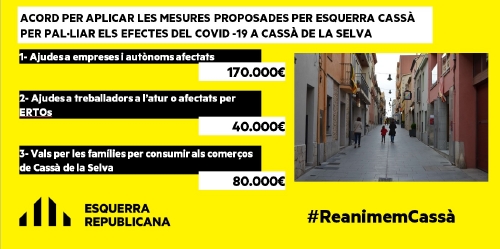 Esquerra Cassà avança que al Ple d’aquest mes de juliol s’aprovaran diverses de les mesures que el grup polític va proposar per destinar-les als col•lectius i persones que pateixen els efectes causats per la COVID-19 des de l’inici de la pandemia. Entre d’altres, les mesures acordades per l’equip de govern i l’oposició, comprenen tres grans línies de treball: