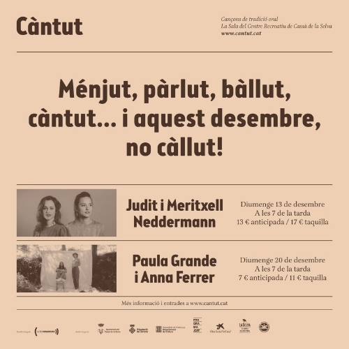 El projecte Càntut. Cançons de tradició oral programa dos concerts aquest desembre a Cassà de la Selva, després de cancel•lar la cinquena edició del festival, que havia de tenir lloc al novembre. Es tracta de dues propostes vinculades a les cançons de tradició oral: el concert de Judit i Meritxell Neddermann, que presentaran les cançons de Present (Satélite K, 2019), i la presentació oficial del disc Vega (Bankrobber, 2020) de Paula Grande i Anna Ferrer. Els concerts tindran lloc els diumenges 13 i 20 de desembre a les 7 de la tarda a la Sala del Centre Recreatiu, i les entrades es posaran a la venda demà divendres a les 10 h a www.cantut.cat.