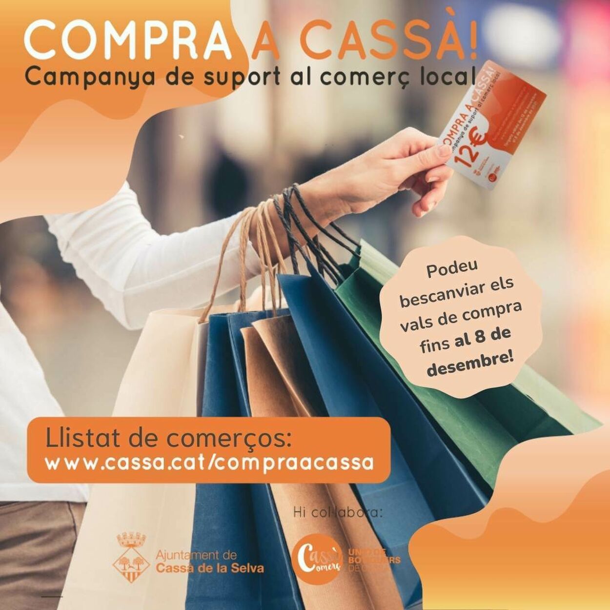 Els vals de compra que s'han repartit a les llars de Cassà, on hi consten persones empadronades, es podran utilitzar a partir d'avui i fins al 8 de desembre (ambdós inclosos) a tots els comerços que trobareu a la llista del web: www.cassa.cat/compraacassa