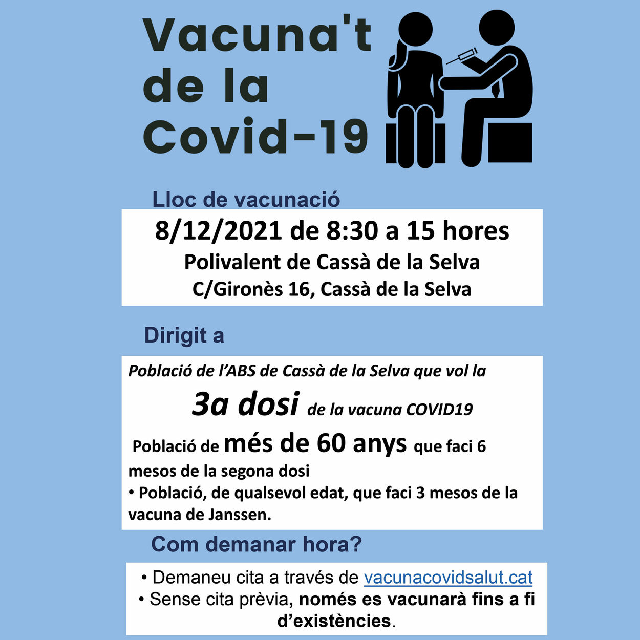 El proper dimecres 8 de desembre, de les 8.30 h a les 15 h, tindrà lloc una jornada de vacunació massiva, amb cita prèvia, de la tercera dosi contra la Covid-19 al Pavelló Polivalent de Cassà de la Selva.