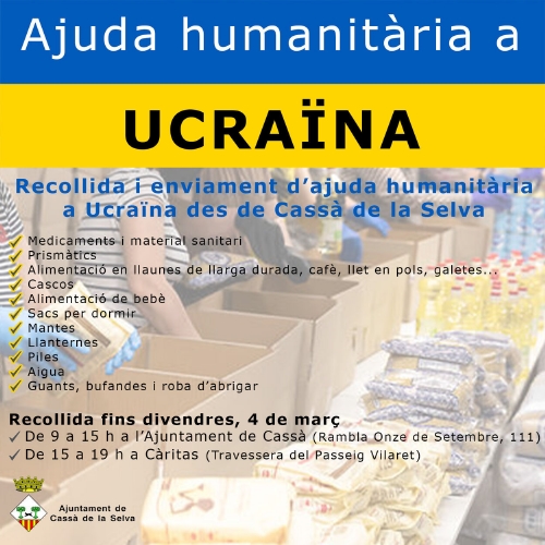 El material, de moment, és recollirà fins aquest divendres, 4 de març, de 9 a 15 h a l’Ajuntament de Cassà, a la Rambla Onze de Setembre, 111. Les tardes es pot portar de les 15 a 19 h al local de Càritas, a la travessera del Passeig Vilaret, de Cassà de la Selva.