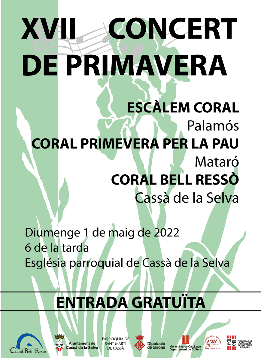 Cassà de la Selva celebrarà el proper diumenge, 1 de maig a les 6 de la tarda, el XVII Concert de Primavera amb la participació de la Coral Bell Ressò de Cassà, l’Escàlem Coral de Palamós i la Coral Primevera per la Pau de Mataró. L’escenari serà, com és de costum, l’esglèsia parroquial de Cassà de la Selva amb entrada gratuïta.