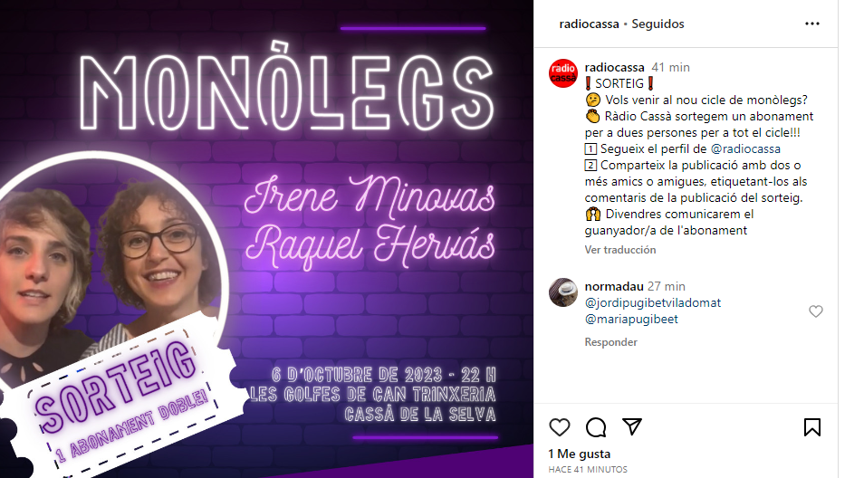 Comparteix la publicació amb dos o més amics o amigues, etiquetant-los als comentaris de la publicació del sorteig.