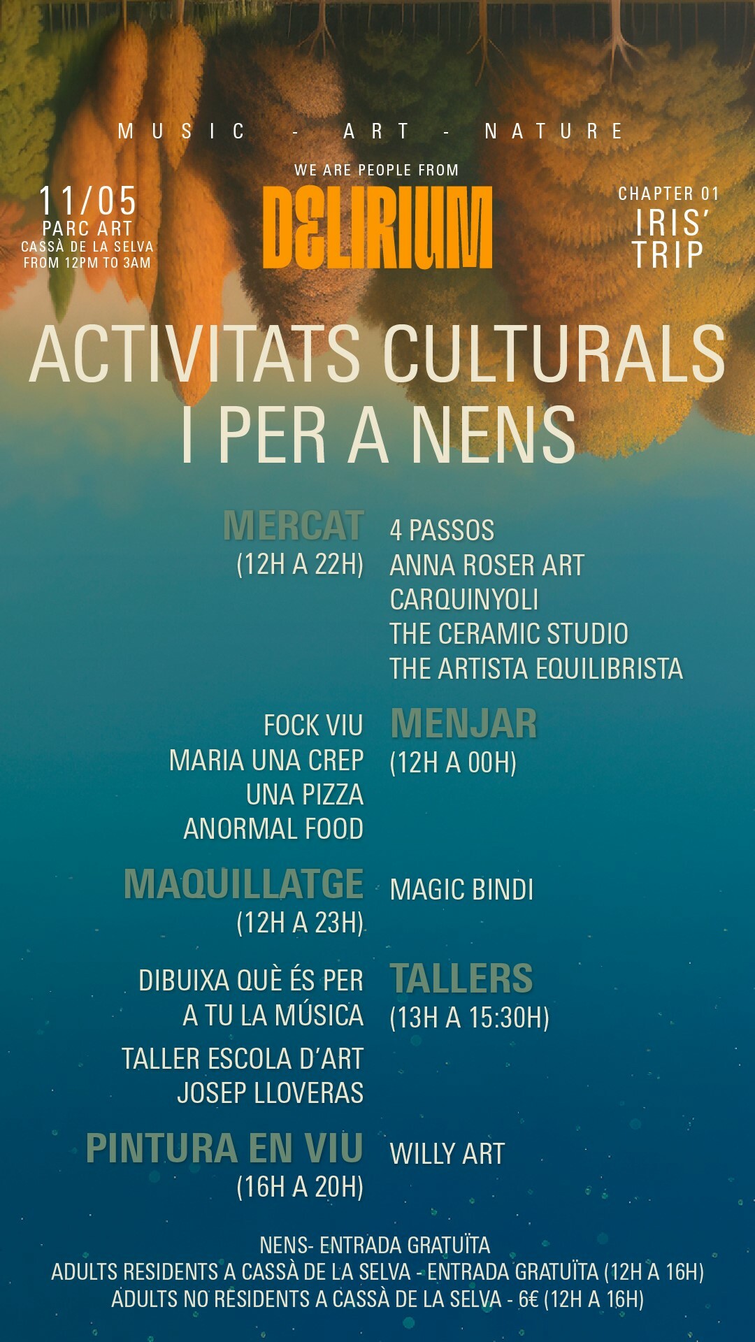 En aquesta ocasió, l’organització del Festival ha preparat una sessió d’activitats per a famílies de 12 a 16 h. El Festival obrirà les portes al migdia, amb un programa d’activitats que ha preparat amb entitats i comerços locals. Aquesta proposta serà gratuïta per als nens i nenes, i pels adults residents a Cassà de la Selva. Les activitats inclouen tallers d’art a més de maquillatge, pintura en viu i parades amb menjar i mercat. A més els visitants podran veure les instal·lacions del Parc Art, aquesta serà una nova localització que els organitzadors han triat per ser un espai singular a l’aire lliure.