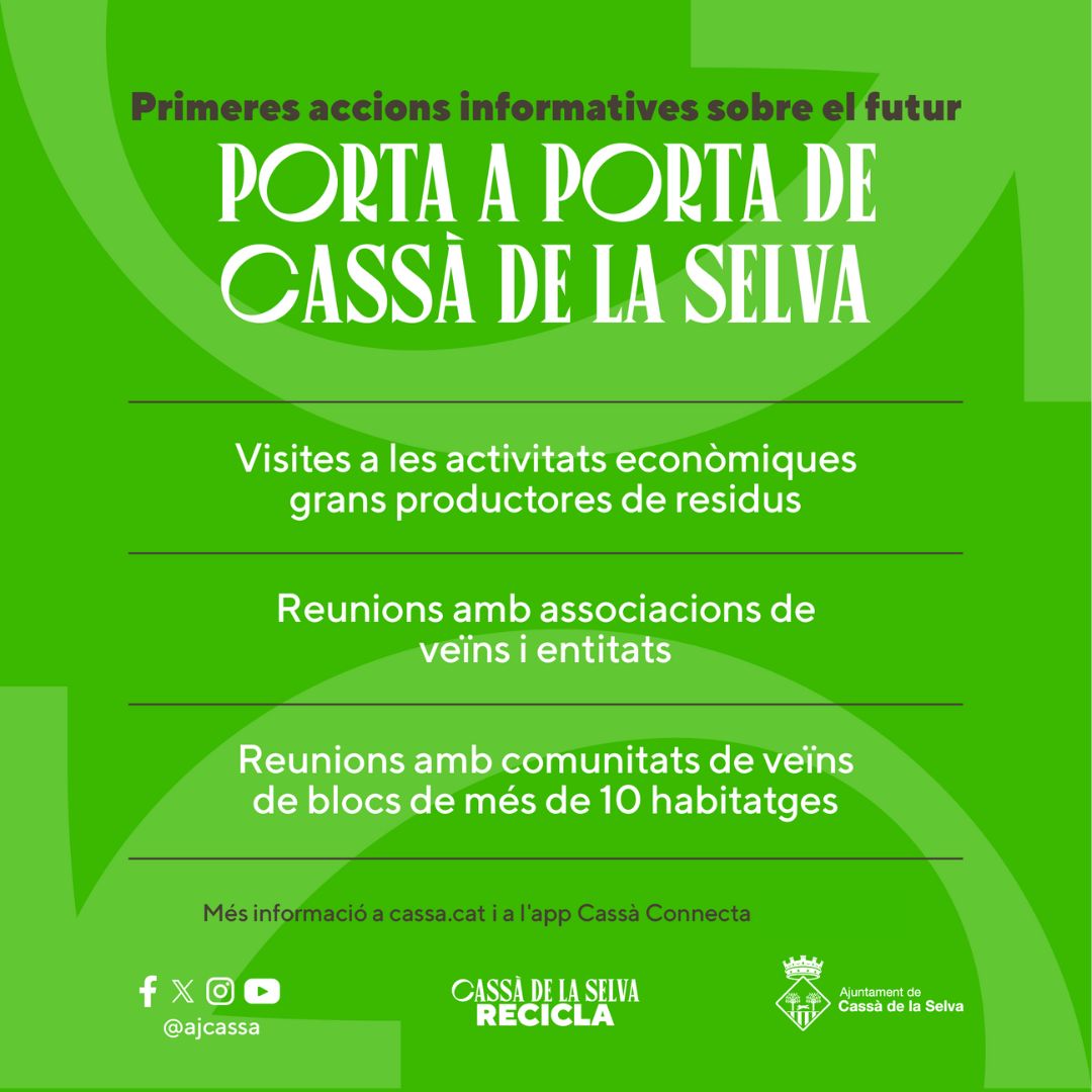 Aquesta setmana s’han programat les primeres reunions informatives per a preparar l’arribada del sistema de recollida “porta a porta” a Cassà de la Selva.