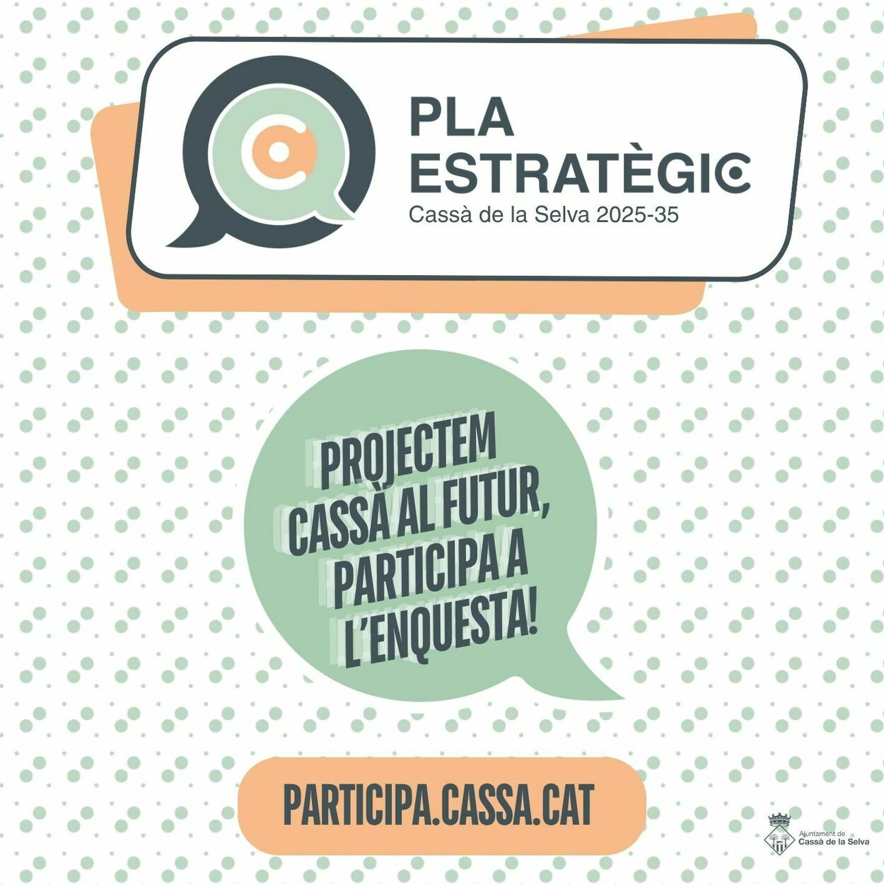 La primera acció participativa consisteix en una enquesta oberta a la ciutadania on es pretenen obtenir les prioritats, les principals mancances i els reptes que tindrà Cassà com a municipi durant la pròxima dècada, podeu participar en l'enquesta a la web participa.cassa.cat.