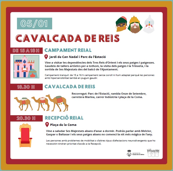 Bon dia i bon any tots els oients de Cassà al Dia! Avui és un dia molt especial, i és que les festes, tot i que estan a punt de finalitzar, no han acabat. El Nadal no acaba fins que no venen ses majestats els Reis Mags de l'Orient, i després d'un llarg viatge, avui Melcior, Gaspar i Baltasar arriben aquesta tarda a Cassà. A partir de les 15h el campament reial obrirà les seves portes. Fins les 16h, serà un campament tranquil, sense soroll ni llum adaptat perquè les persones amb hipersensibilitat perquè també en puguin gaudir. I llavors, fins les 18h, es podran visitar al Jardí de Can Nadal i al parc de l'Estació les dependències dels Tres Reis d’Orient i els seus patges i patgesses. Es podrà gaudir de tallers artístics per a tothom, la visita dels patges i la Trinxeta, i la sortida de Ses Majestats des del balcó de l’Ajuntament. A dos quarts de set, s'iniciarà la cavalcada, des del parc de l’Estació passant per rambla Onze de Setembre, la carretera Marina, el carrer Indústria i acabant com sempre a la plaça de la Coma. A partir de quarts de nou, es podran saludar Ses Majestats abans d’anar a dormir en la que és la nit més màgica de l’any. Les persones amb problemes de mobilitat o d’altres tipus d’afectacions neurodivergents que ho necessitin tindran prioritat d’accés a la Recepció. Que vagi molt bé, i a dormir aviat, perquè portin moltes coses els Reis.
